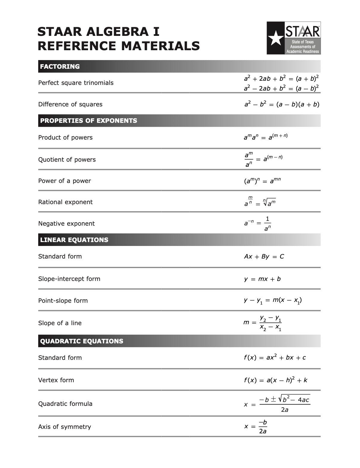 Alg Formula Chart Pdf Staar Staar Algebra I Reference Materials State Of Texas Assessments Of Academic Readiness Factoring Perfect Square Trinomials Course Hero