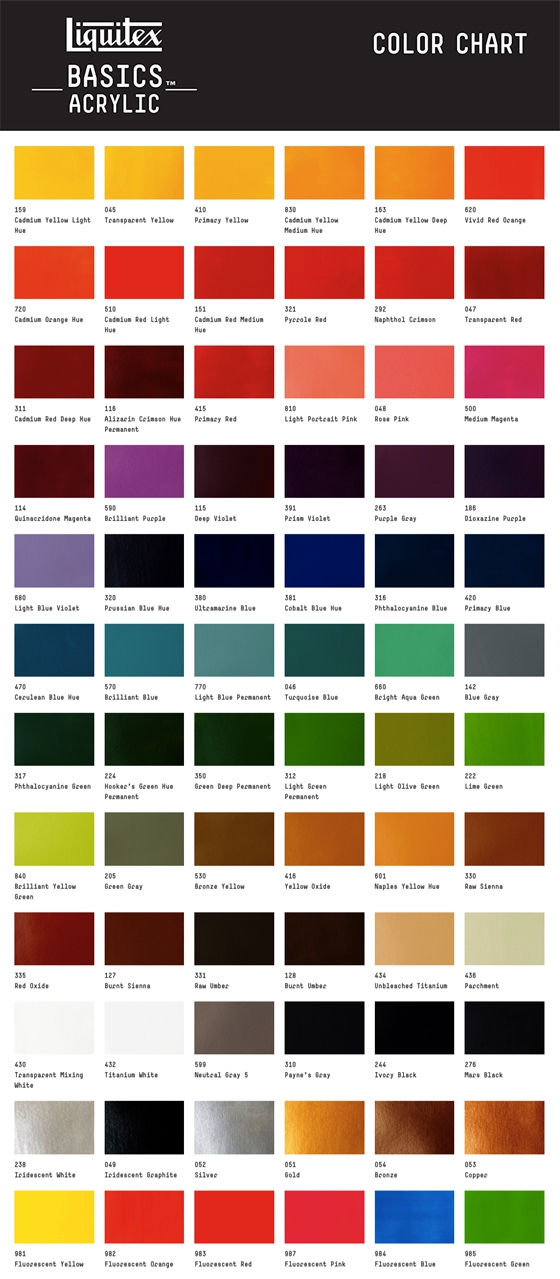 Liquitex basics color chart. Click here for the Liquitex Basics Acrylic Colors colour chart. Which means theyre made with the same lightfast fine art pigments we use in our professional range but just a lighter load. Each color is uniquely formulated to bring out the maximum brilliance and clarity of the individual pigment.