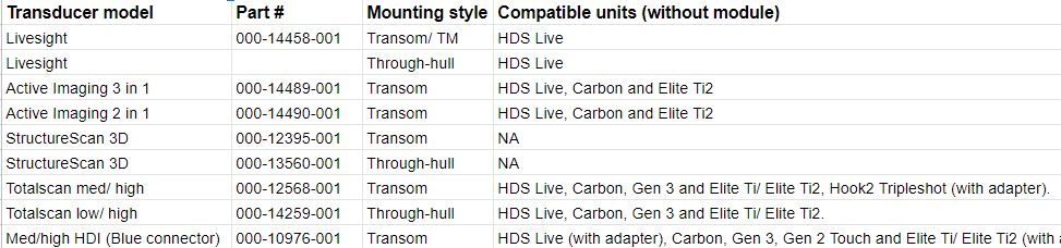 Lowrance transducer compatibility chart. The list is in a Google Sheet and you can find it here. Sun and Dust Covers. Humminbird provides the most complete offering of.