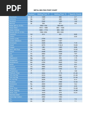 Metal melting point chart. 33 rows Metal Symbol Melting Point F Melting Point C Specific Gravity. Ive also listed the crystal structure which will come up later. MELTING POINTS OF THE ELEMENTS atmospheric pressure s sublimes ELEMENT SYMBOL MELTING POINT F MELTING POINT C Aluminum Al 1220 660 Antimony Sb 1168 631 Arsenic As 1135 s 613 s Barium Ba 1341 727 Beryllium Be 23486 1287 Bismuth Bi 520 2713 Boron B 3767 2075 Cadmium Cd 610 321 Calcium Ca 1544 840 Carbon C 6588 s 3642.