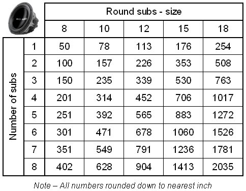 IdBL Classes are based on the cumulative total of all subwoofer cone surfaces in square inches see cone area calculation chart. Three 12 33929. The radius of all subwoofers is half the diameter so the radius of a ten inch subwoofer would be 5 inches.
